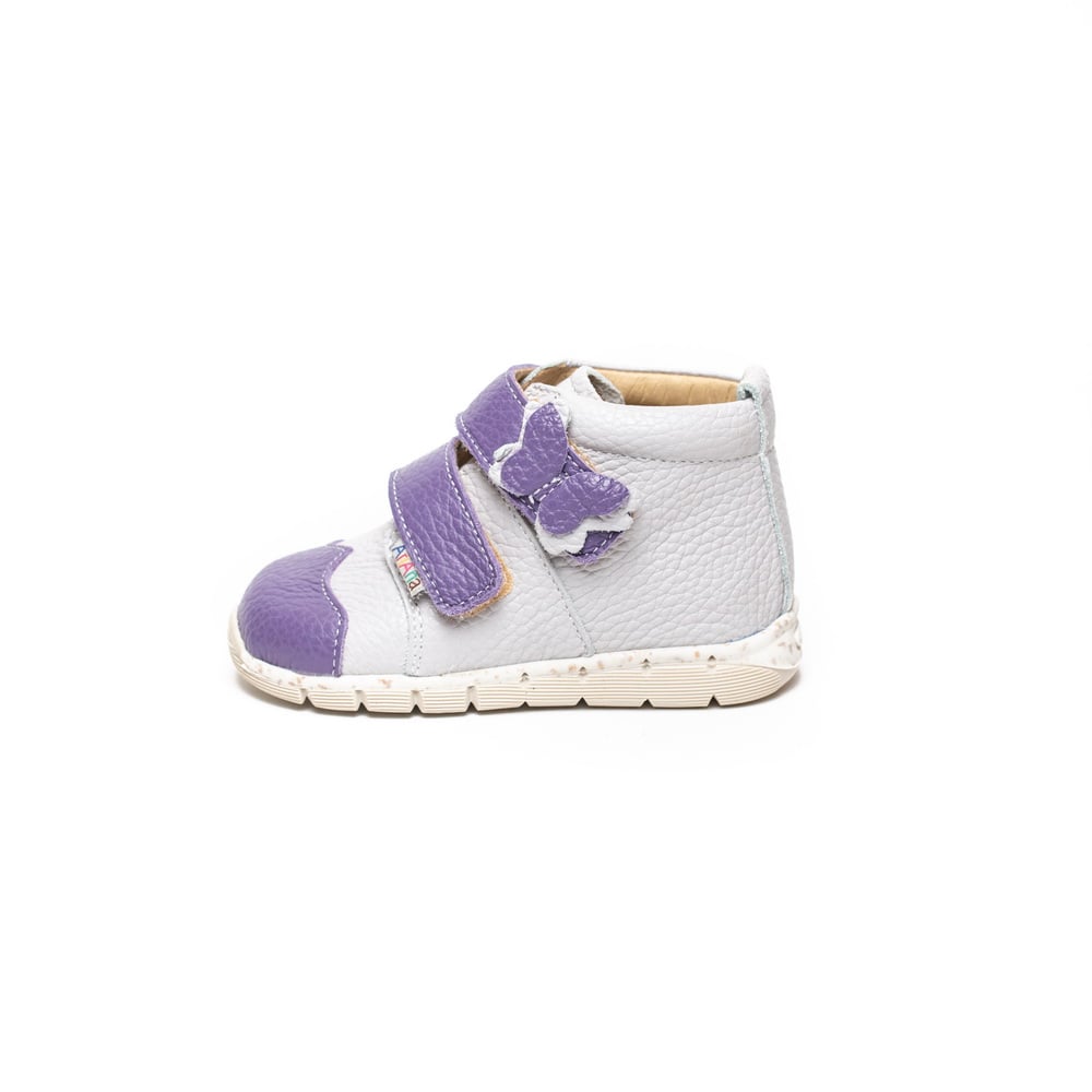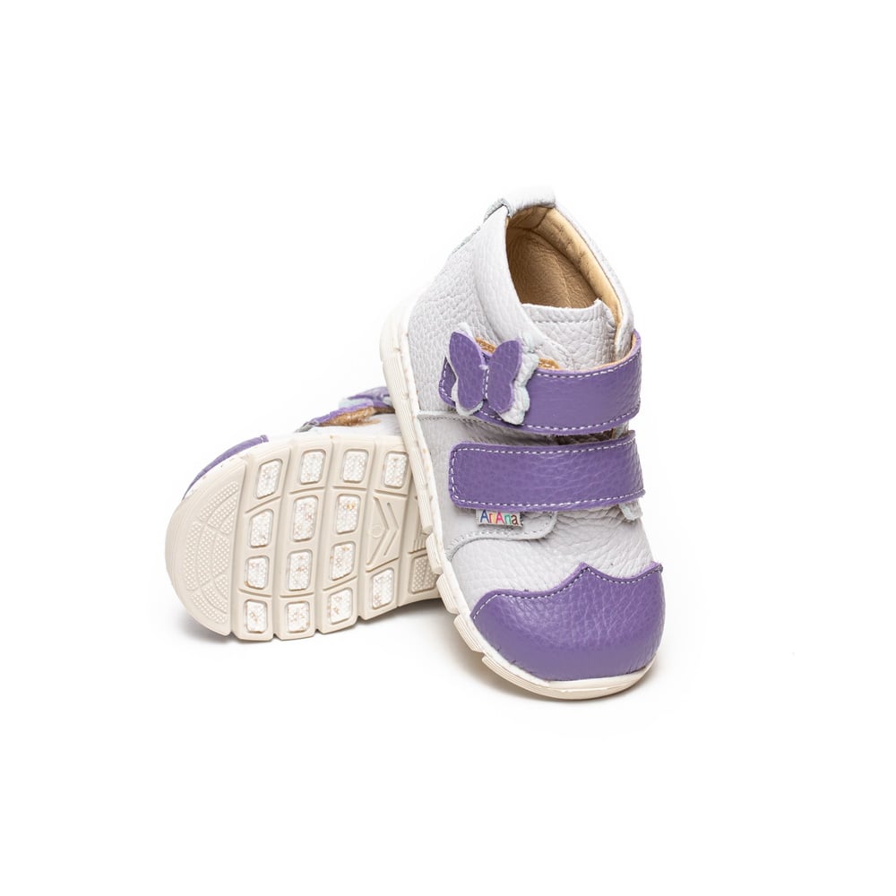 Gray and purple natural leather boots.